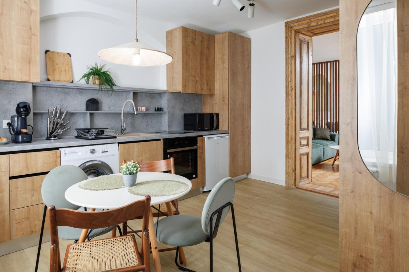 Studio Apartment. The apartment features 1 bedroom and 1 bathroom with a walk-in shower and free toiletries. The well-equipped kitchen has a stovetop, a refrigerator, an oven and a microwave. The apartment provides a washing machine, a coffee machine, heating, as well as a TV. The unit offers 2 beds.