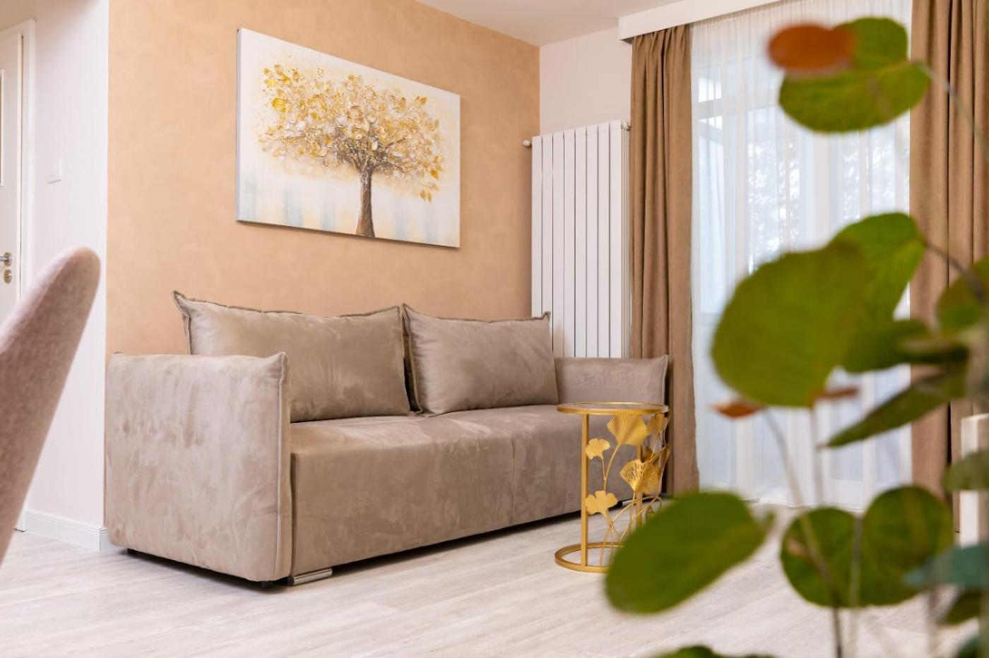 One-Bedroom Apartment. Boasting a private entrance, this air-conditioned apartment comes with 1 living room, 1 separate bedroom and 1 bathroom with a walk-in shower and a hairdryer. Guests can make meals in the kitchen that features a stovetop, a refrigerator, an oven and a microwave. The apartment features a washing machine, soundproof walls, a tea and coffee maker, a flat-screen TV with streaming services, as well as garden views. The unit has 2 beds.