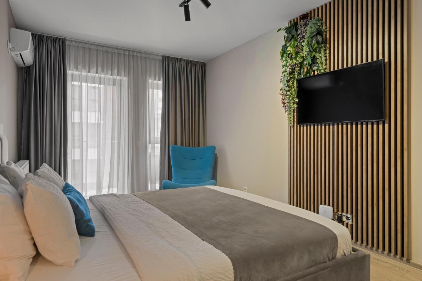 One-Bedroom Apartment. The well-equipped kitchen features a stovetop, a refrigerator, an oven and a tea and coffee maker. This apartment has air conditioning, a washing machine, a flat-screen TV and a balcony. The unit has 1 bed.